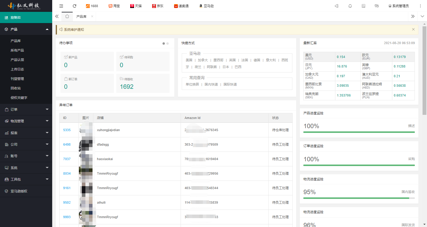 首頁展示系統(tǒng)最新通知、待辦事項、最新匯率以及用戶方便、快捷的定位查看自己店鋪的異常訂單等